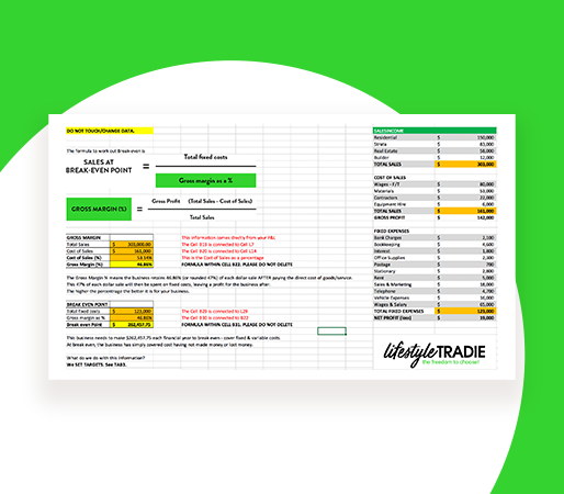 Get this break-even and targets template, formatted specifically for tradies in business to plug-in their own numbers for details on break-even to help you make informed decisions.